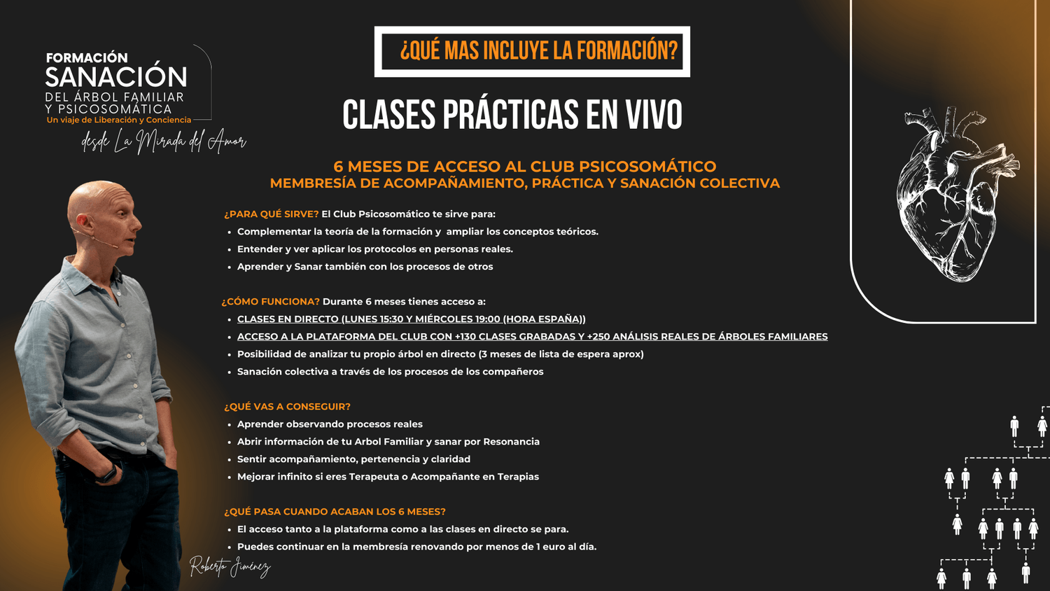 El contenido teórico es grabado y lo tienes durante 2 años, la membresia del Club Psicosomático (las clases en directo) están activas durante 4 meses, luego puedes renovarlas en formato membresía sin compromiso de permanencia. El contenido teórico lo puedes renovar dentro de 2 años y puedes seguir teniéndolo 2 años más.
